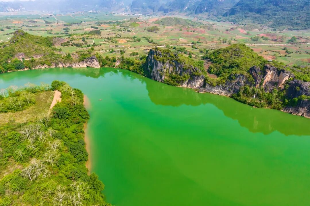 河水流经喀斯特山区,溶解了岩石中的矿物质,加上河底幽深的潭水倒映,两岸又长满了茂密的树木和竹林,阳光一照,水面就泛着墨绿或深蓝的光泽。