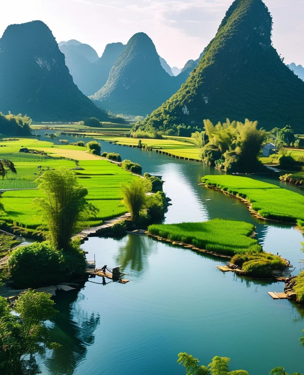 这里没有刻意的雕琢,只有最本真的南方乡村模样。青峰如笋,拔地而起,倒映在蜿蜒的明仕河面。