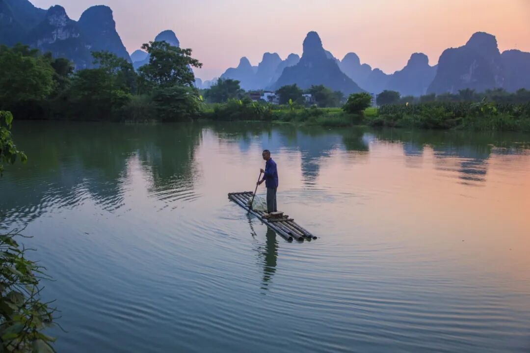 竹筏慢悠悠划过水面,白鹭从田埂上掠过,远处壮族村寨的吊脚楼点缀山脚,炊烟混着晨雾升起时,仿佛连时间都跟着慢了下来。